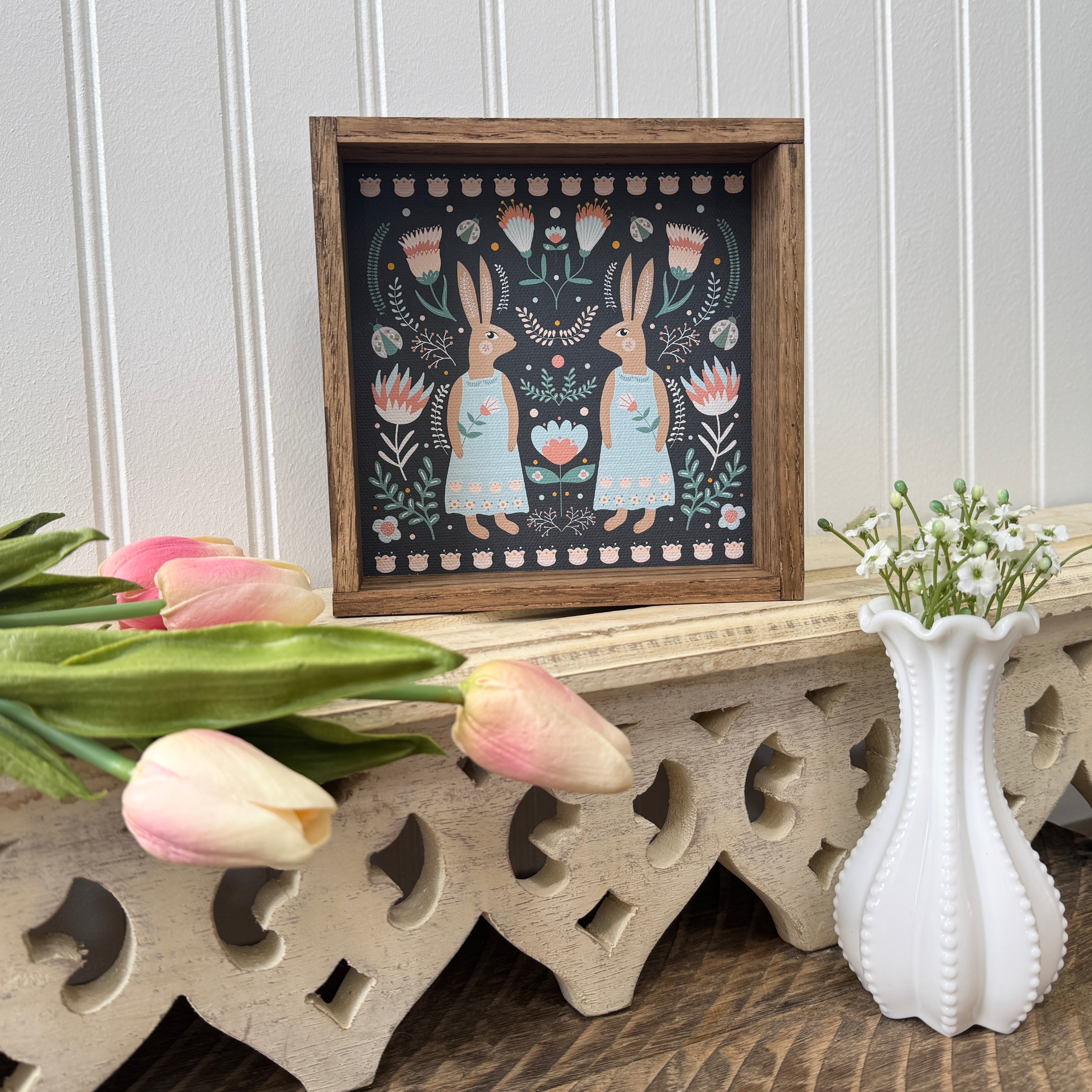 "Great quality! Shopping online can be so hard. Let me tell you, these are as pretty in person as they look online! You won’t be disappointed. They are nice prints, the wood is quality, love the stain color and they are nice & sturdy."